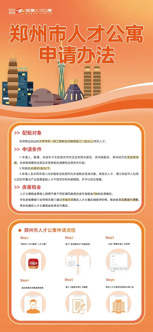 本批次配租全流程通過線上進行,按照“一網(wǎng)通辦、一網(wǎng)通管”的原則,申請人可登錄“鄭好辦”APP(“一件事專區(qū)”→“住房保障一件事”),進入人才公寓配租模塊,按照提示進行申請、選房、簽約和退出。